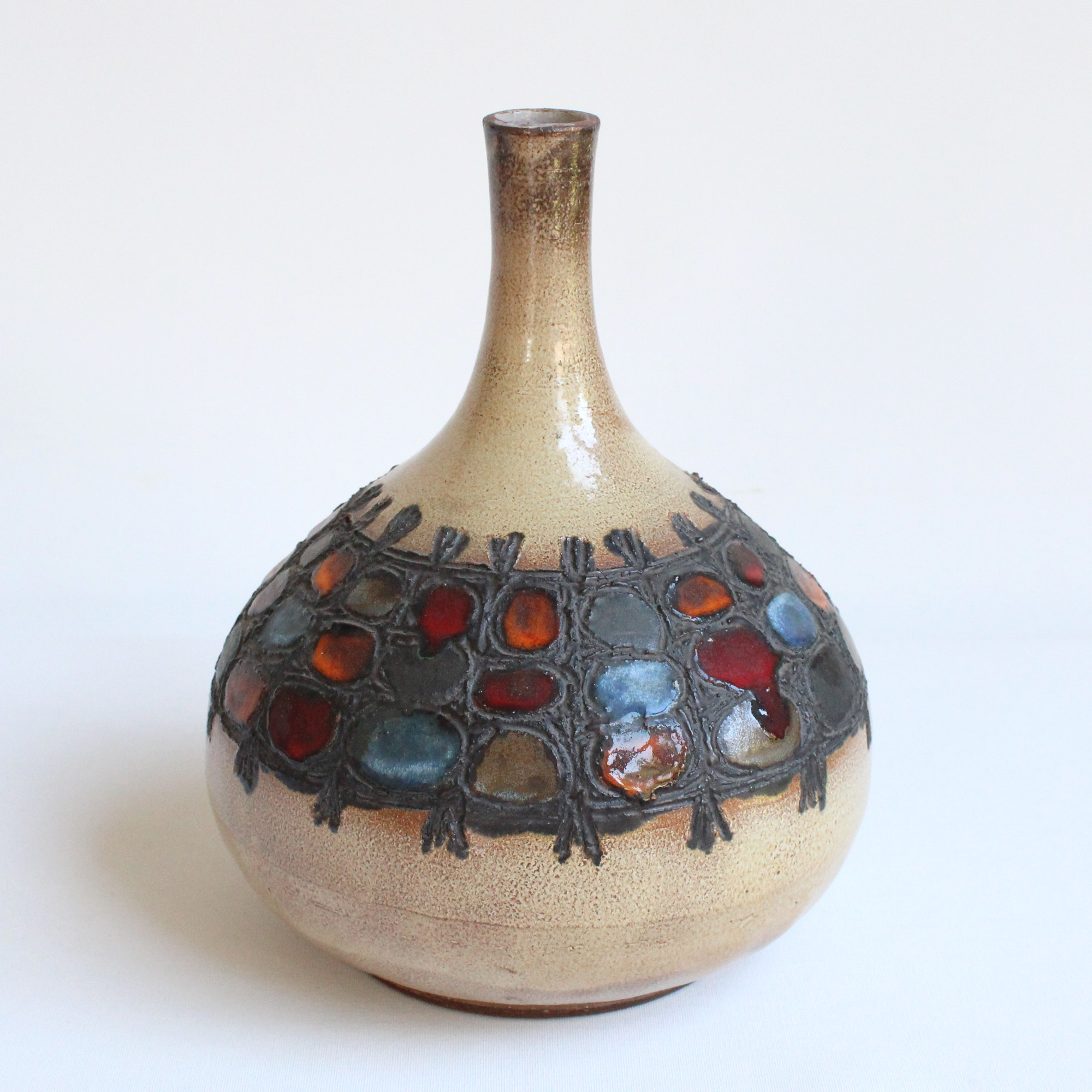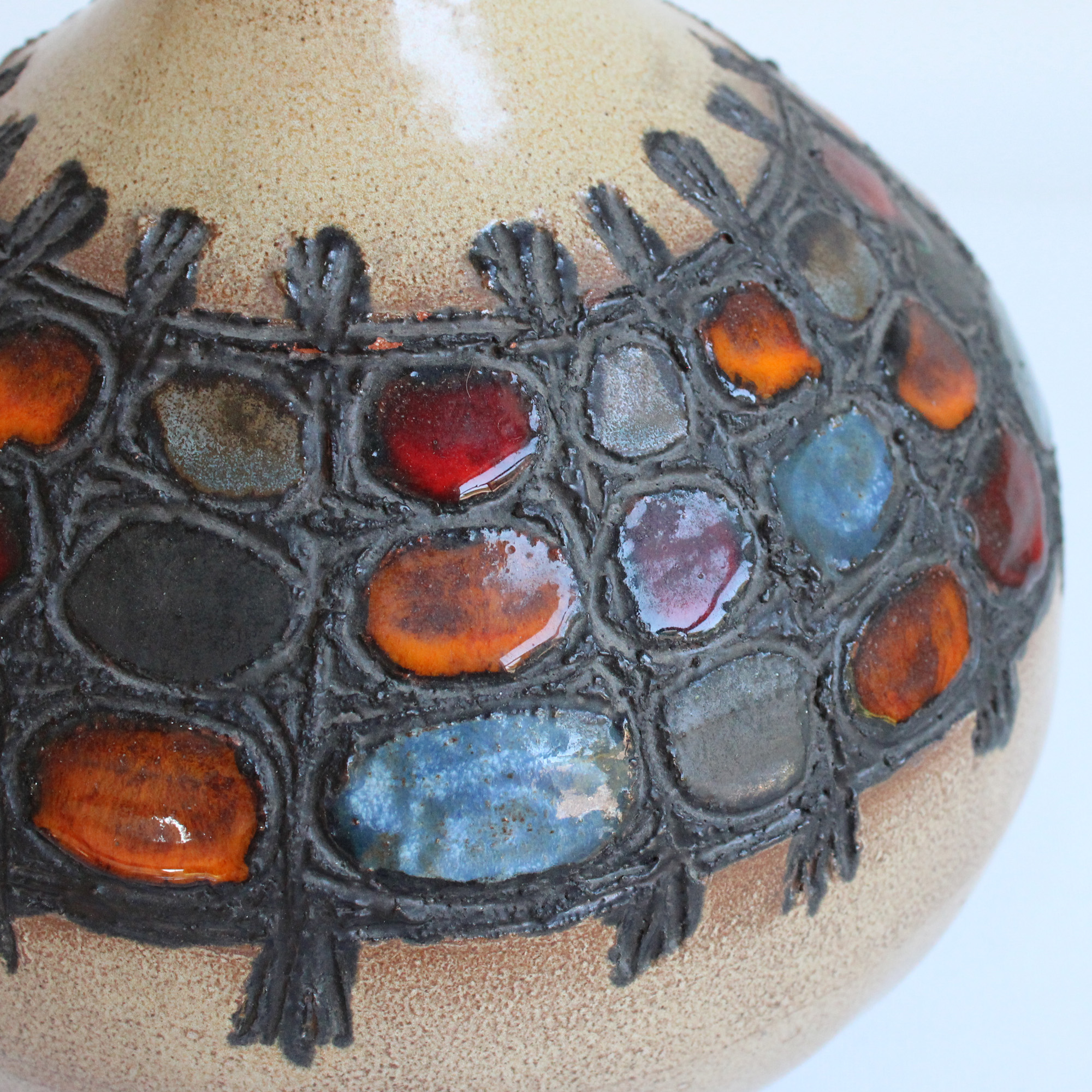 Imposant vase "figue" soliflore brutaliste en céramique émaillée, dans les tons ocres, motif décoratif de pastilles colorées.