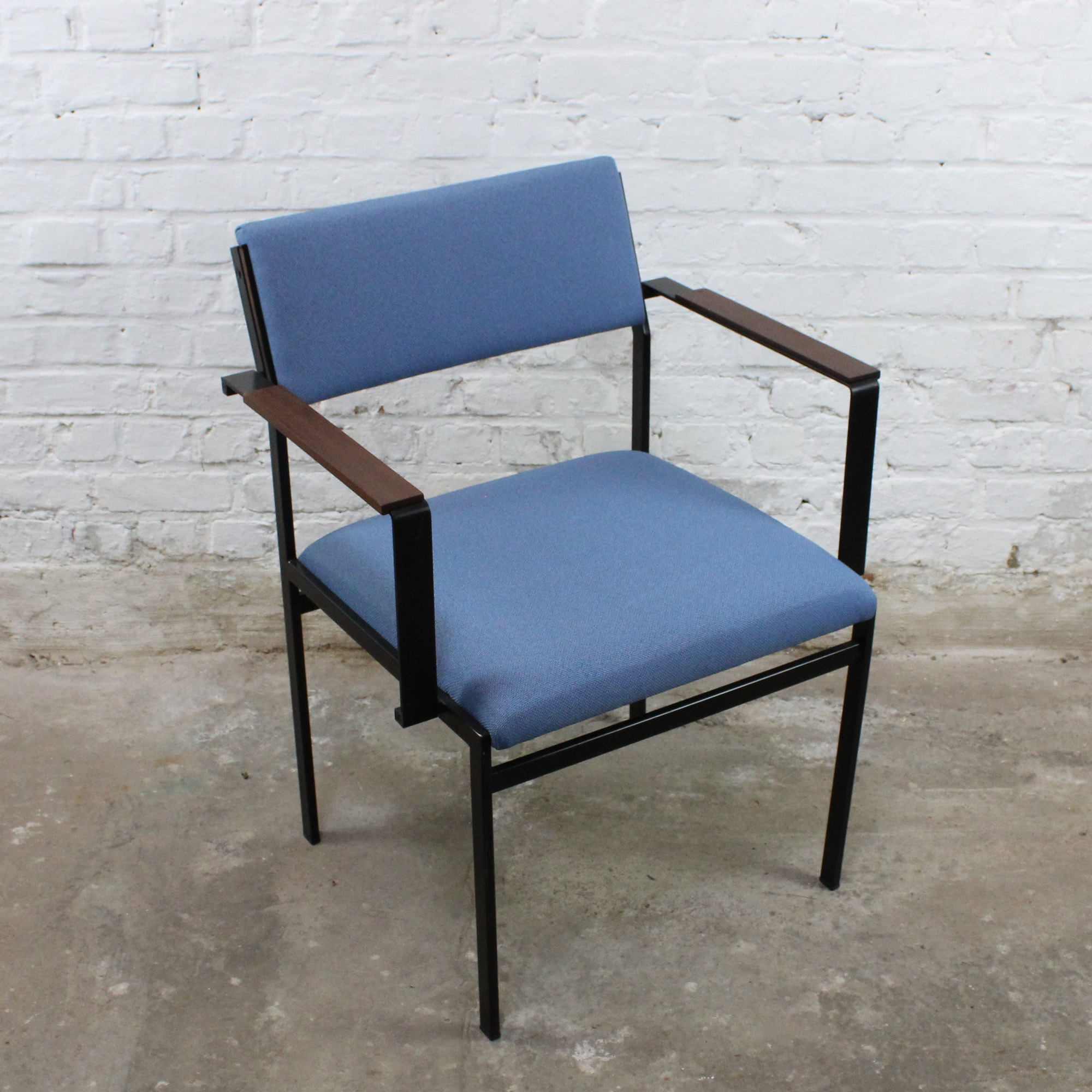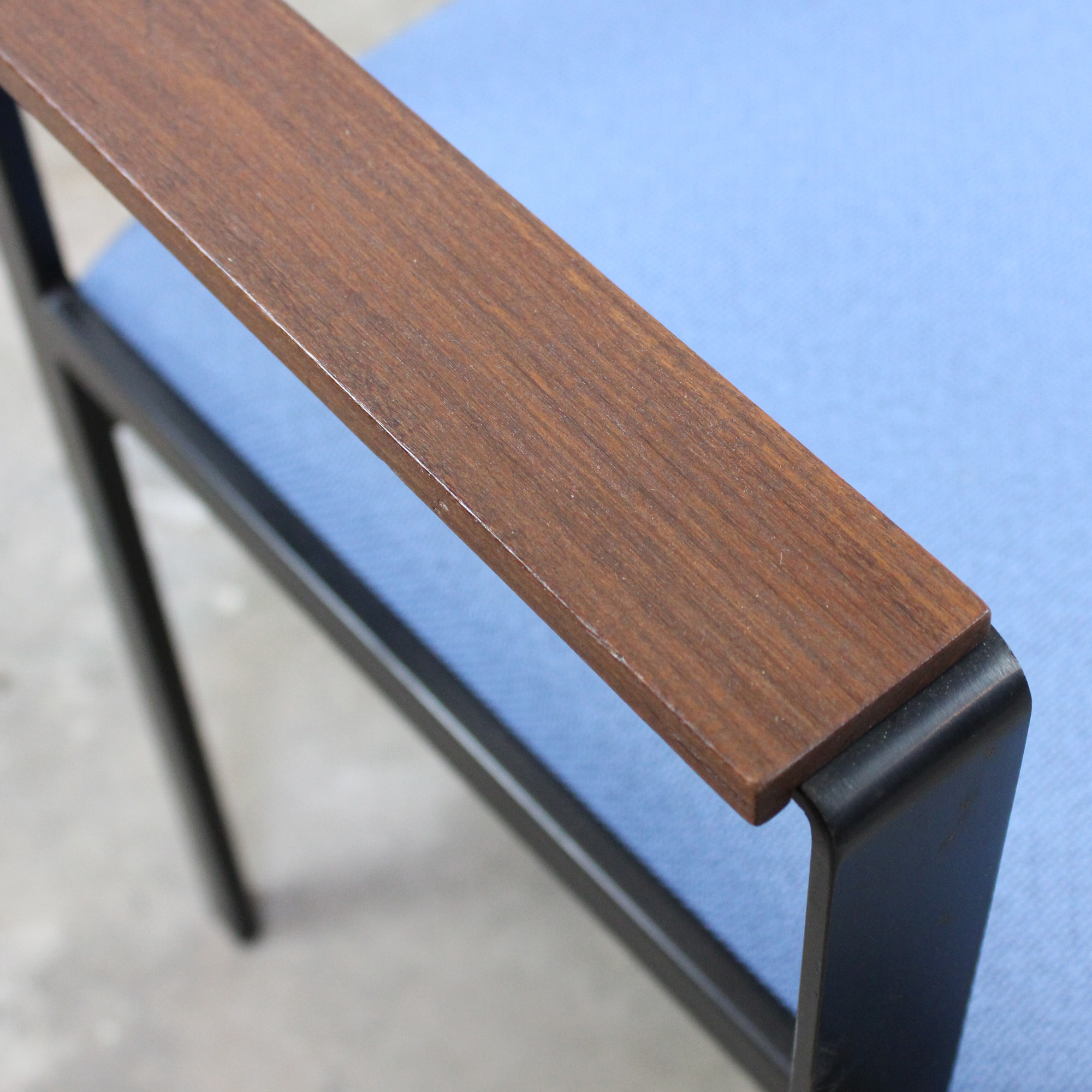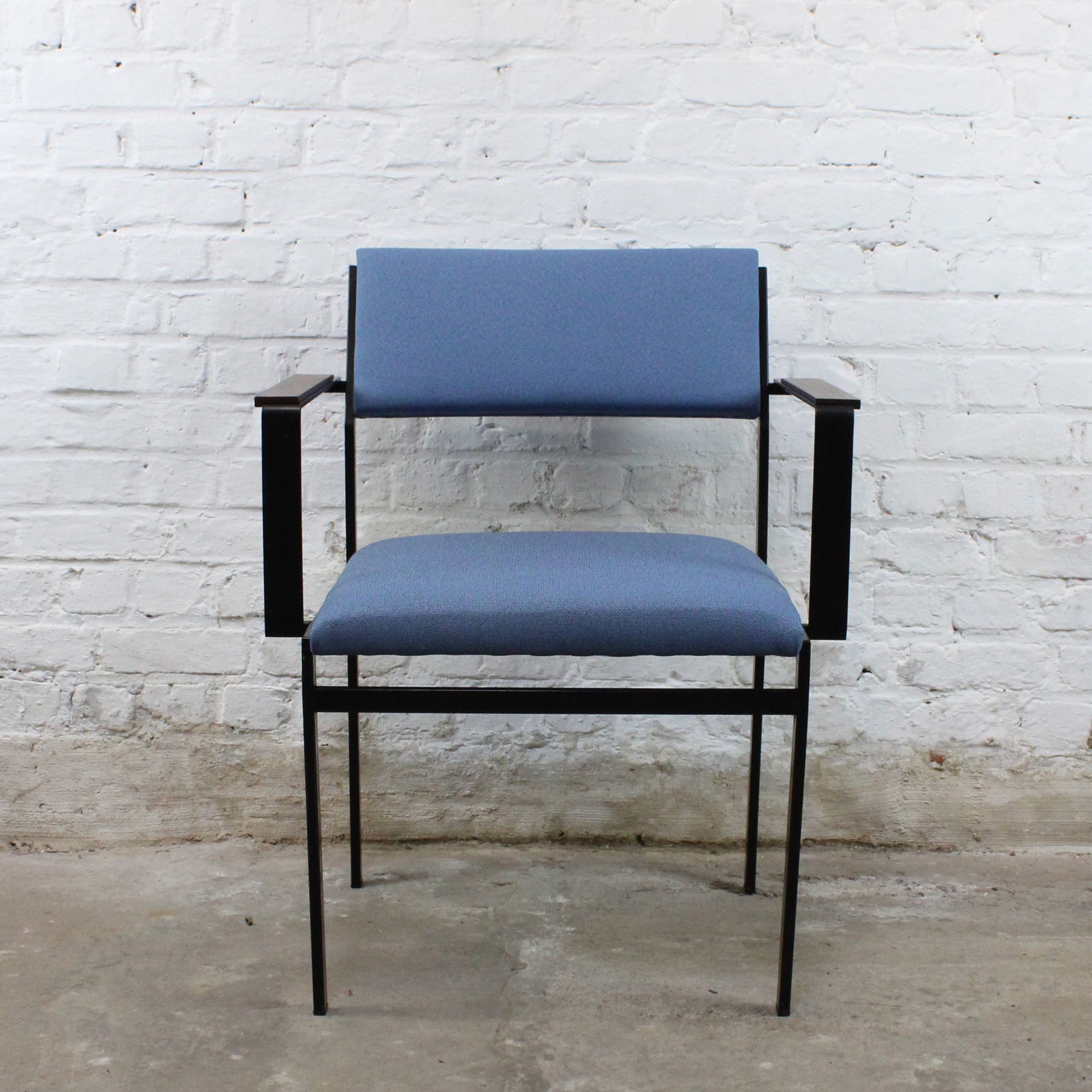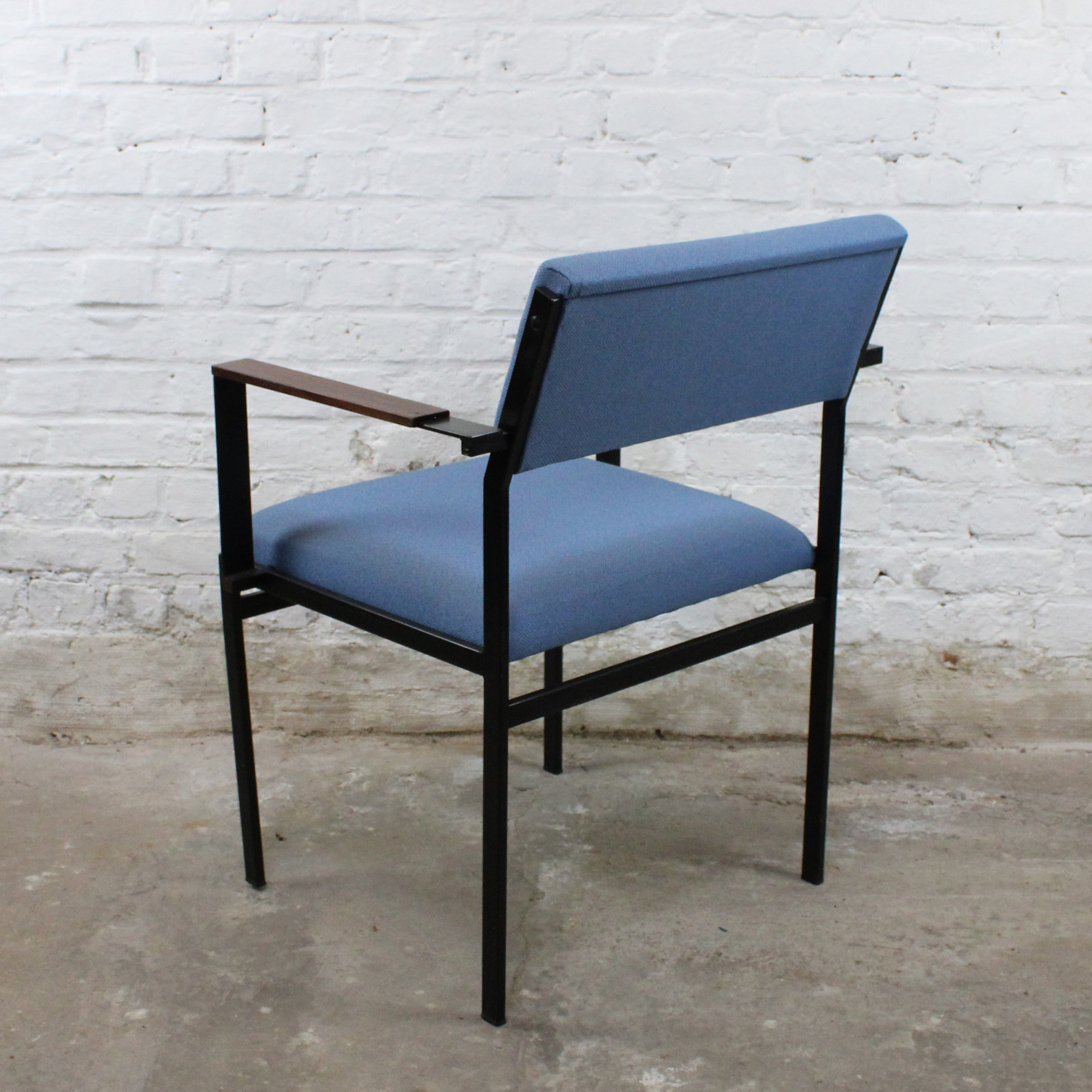 Fauteuil modèle "SM17" de Cees Braakman pour Pastoe. Modèle produit entre 1958 et 1965. Structure en acier laqué noir, accoudoirs en bois massif, assise et dossier garnis de tissu.