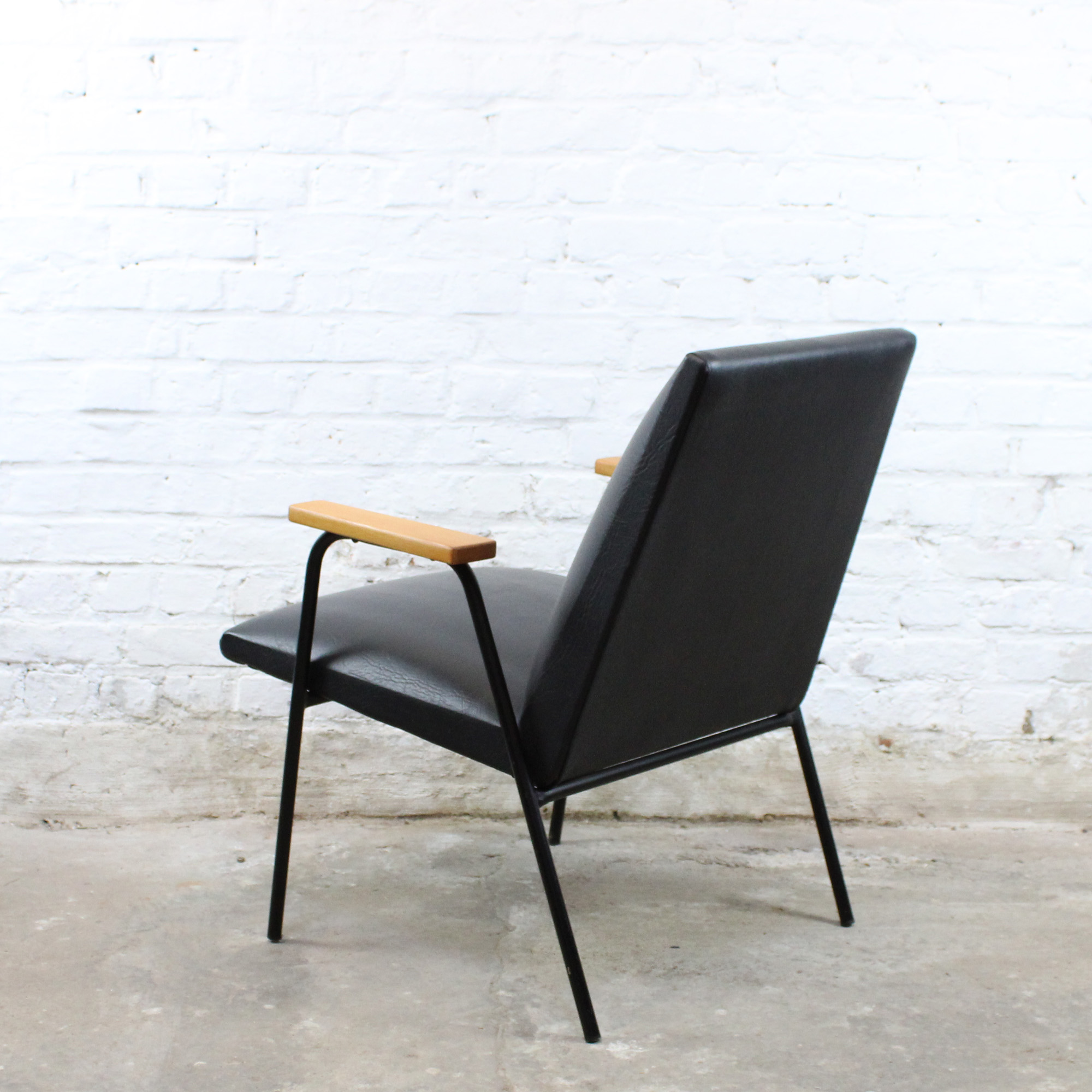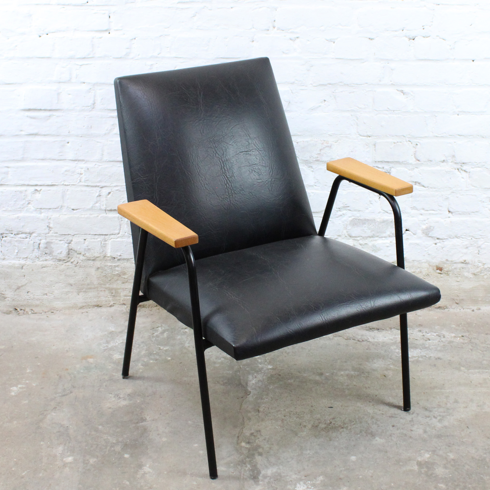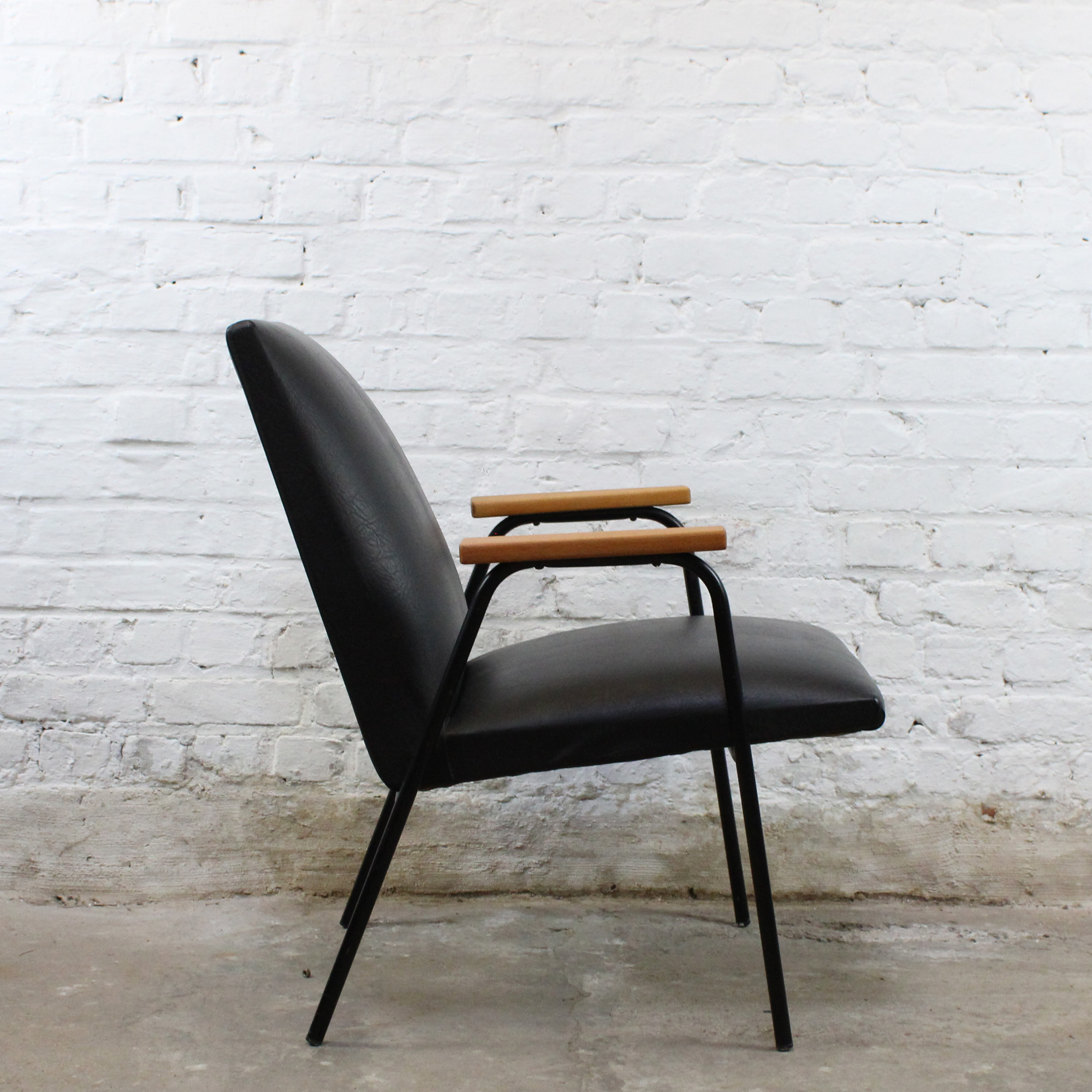 Fauteuil moderniste modèle "Robert" de Pierre Guariche pour Meurop. Modèle produit entre 1962 et 1967. structure en bois recouvert de simili ton noir, pied en acier laqué noir, accoudoirs en bois massif.