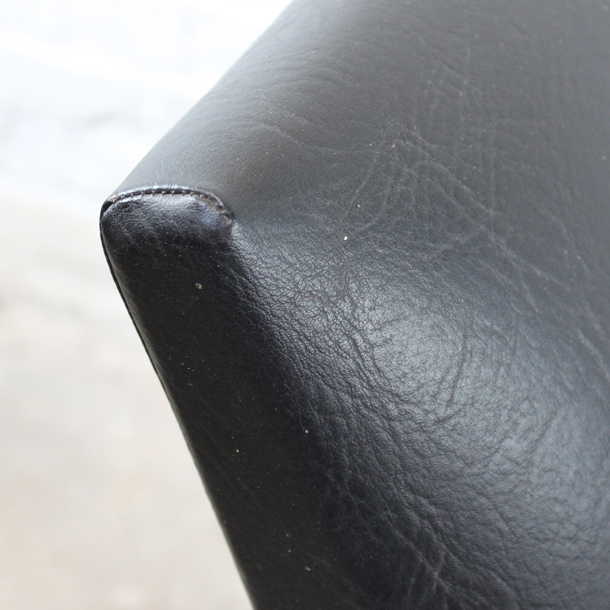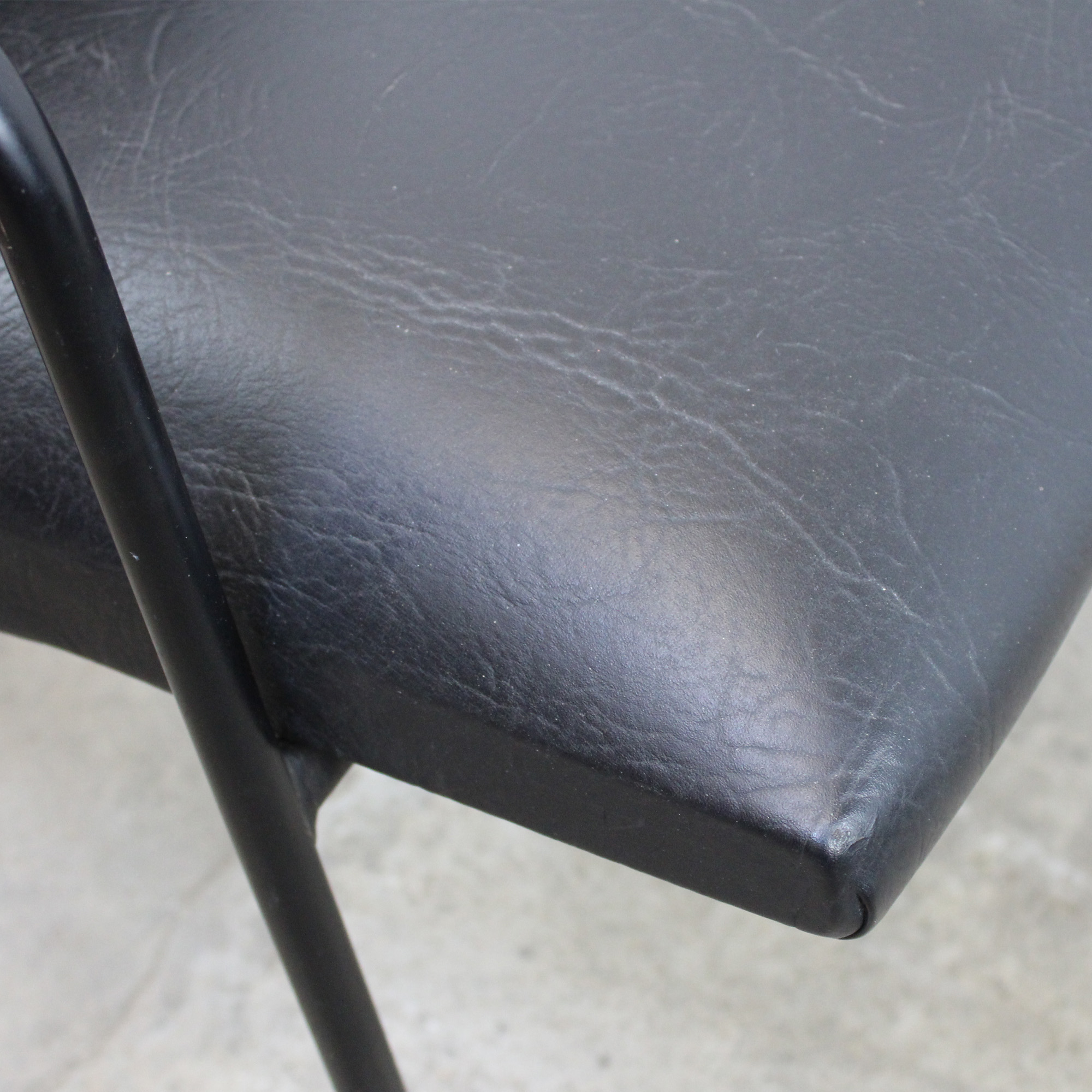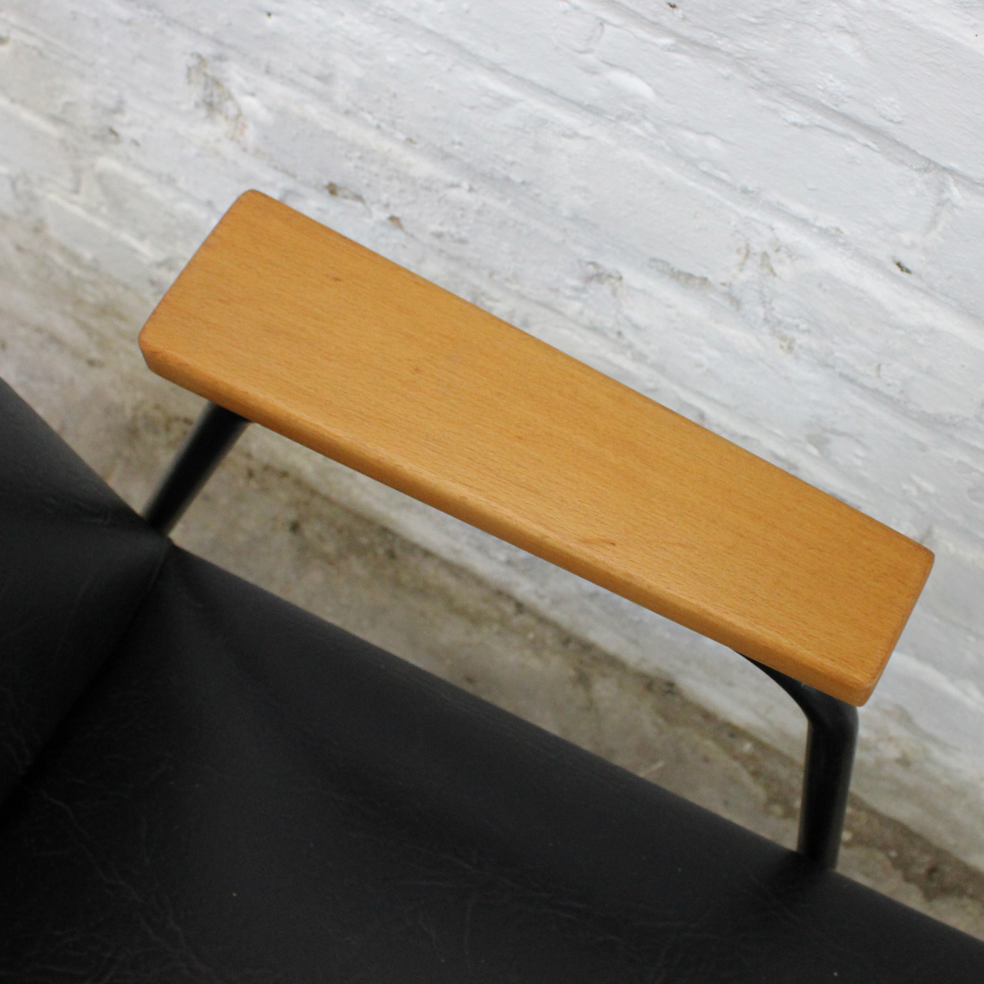 Fauteuil moderniste modèle "Robert" de Pierre Guariche pour Meurop. Modèle produit entre 1962 et 1967. structure en bois recouvert de simili ton noir, pied en acier laqué noir, accoudoirs en bois massif.