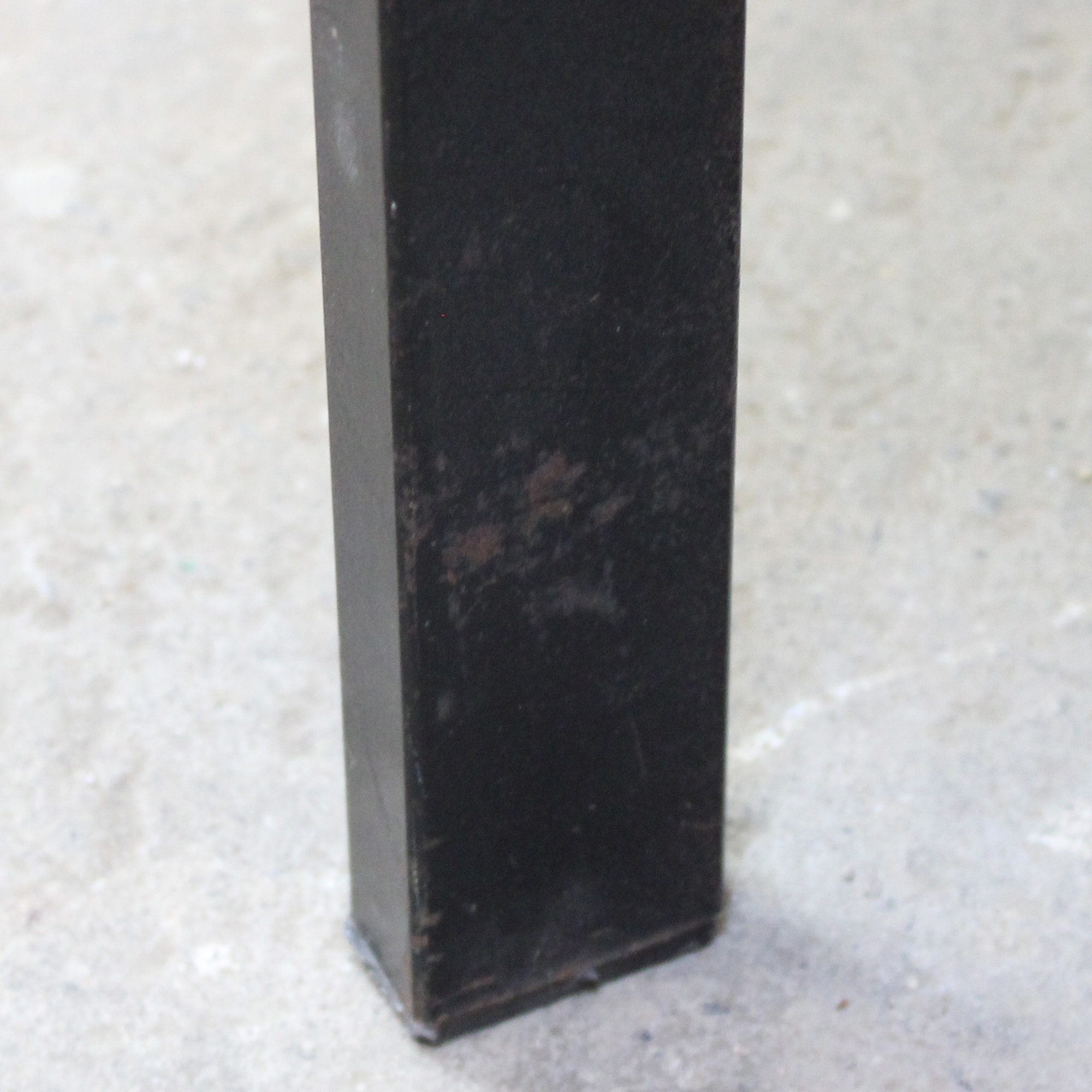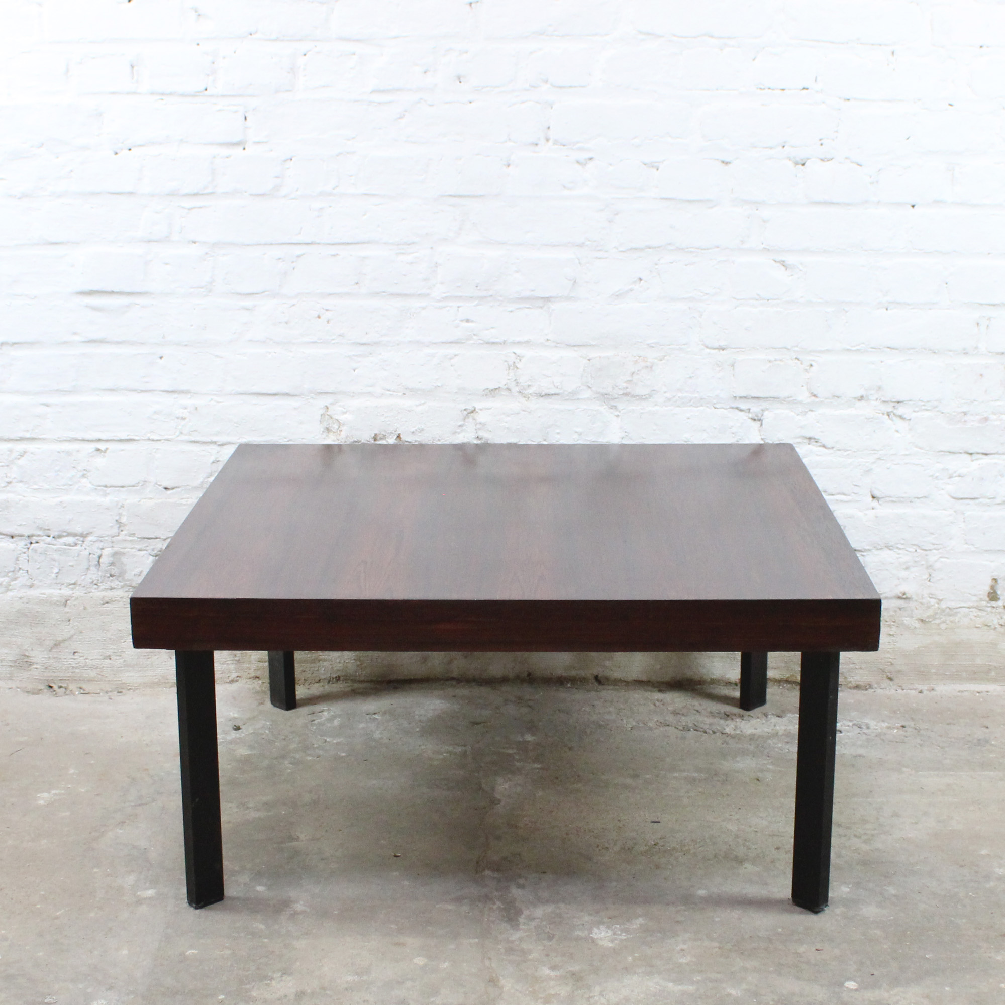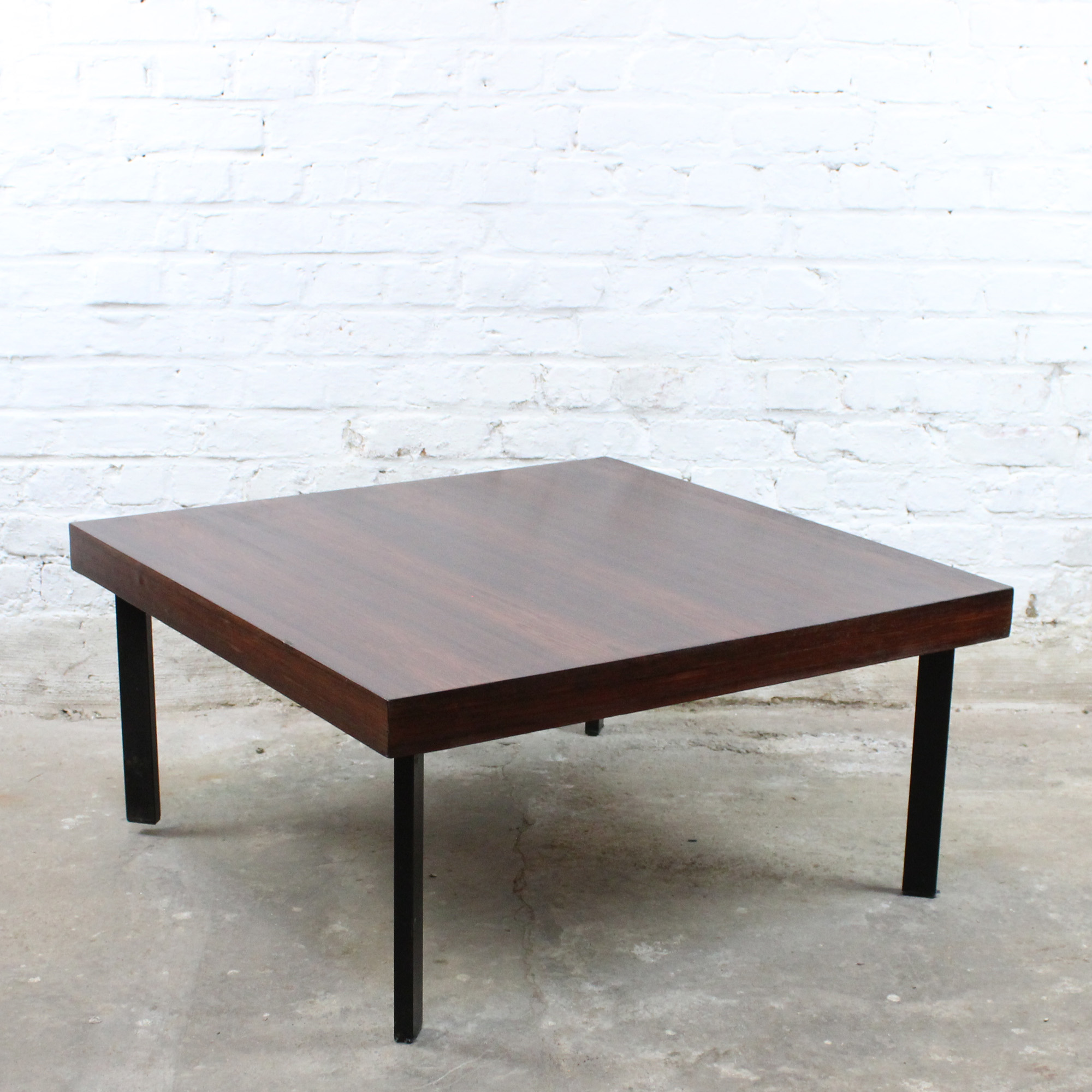 Table basse ou guéridon "carré", de Pierre Guariche, édition Meurop entre 1961 et 1967. Pieds en acier laqué noir, plateau en panneau aggloméré plaqué teck. Il s'agit ici de la première série (1961-1962), avec les pieds à section rectangulaire placés à 45°. Modèle rare !